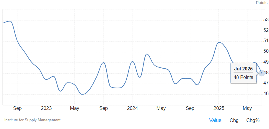 - ISM Manufaktur: Indeks harga yang dibayarkan oleh sektor manufaktur turun menjadi 48. Meskipun masih di level tinggi (Yang sekarang masuk kepada angka Kontraksi, dibawah 50 artinya kontraksi), angka ini turun, menandakan adanya moderasi tekanan biaya bahan baku untuk pabrik. Ini adalah sinyal disinflasi (perlambatan inflasi).