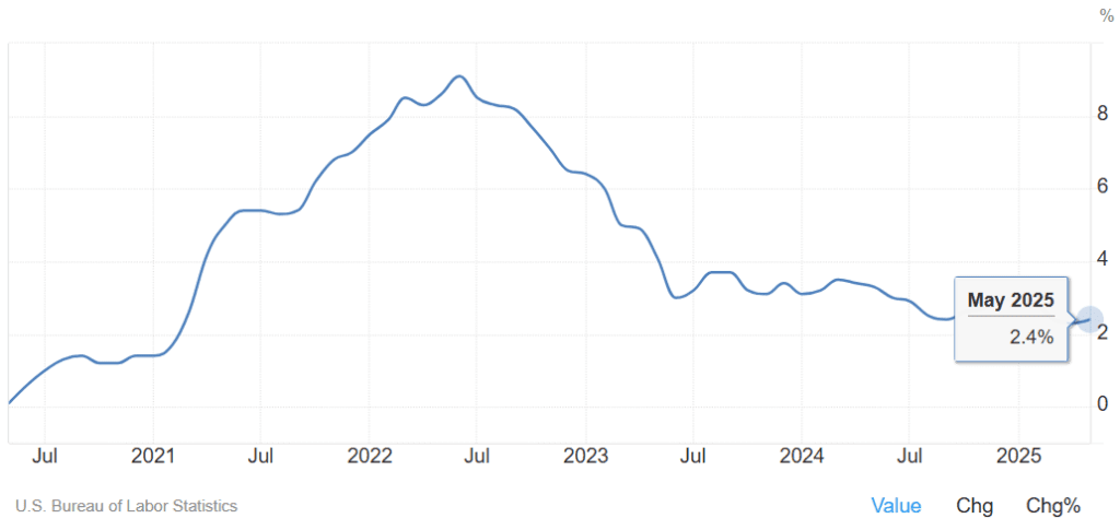 Laju inflasi tahunan di Amerika Serikat telah menunjukkan perlambatan yang luar biasa, turun drastis dari puncaknya di sekitar 9% pada pertengahan 2022. Memasuki pertengahan 2025, angka inflasi umum (YoY) stabil di kisaran 2,3–2,4%, sebuah level terendah sejak awal 2021. Penurunan signifikan ini sebagian besar didorong oleh normalisasi harga energi global dan base effect yang menguntungkan, di mana lonjakan harga ekstrem tahun sebelumnya tidak lagi menjadi bagian dari perhitungan tahunan.