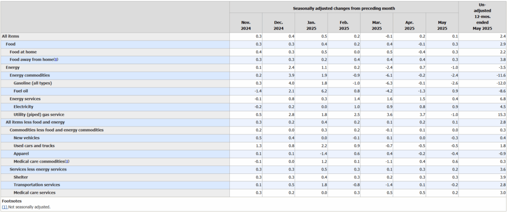 - Energi: Telah menjadi penahan laju inflasi yang kuat selama berbulan-bulan, dengan indeks energi turun –3,5% YoY hingga Mei 2025. Namun, ada indikasi kuat bahwa harga bensin mulai rebound pada bulan Juni karena permintaan musiman musim panas dan stabilitas harga minyak dunia. Hal ini berpotensi besar mengurangi efek penahan inflasi dari sektor energi.
