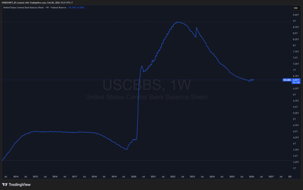 Namun, jika kita melakukan analisis yang mendalam, kita dapat memahami bahwa kebijakan moneter memiliki dua kaki: Harga Uang (Suku Bunga) dan Kuantitas Uang (Neraca/Likuiditas). Warsh adalah kritikus vokal terhadap besarnya neraca The Fed yang saat ini mencapai sekitar $6.6 Triliun. Ia memandang neraca yang bengkak sebagai bentuk “Represi Finansial”, distorsi pasar yang mematikan sinyal harga, dan pelanggaran batas antara kebijakan moneter dan fiskal.