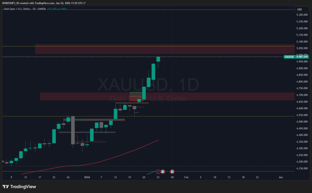Horizon Fx Indonesia – Membahas Outlook Harga Emas 2026. Kita mulai dari pergerakan harga emas (XAU/USD) pada pembukaan kuartal pertama tahun 2026 telah menciptakan preseden sejarah baru dalam pasar komoditas global. Saat ini, emas diperdagangkan di kisaran $4.987,55, hanya terpaut beberapa poin dari level psikologis masif di $5.000. Kenaikan ini bukan sekadar fluktuasi teknikal biasa, melainkan manifestasi dari pergeseran tektonik dalam lanskap makroekonomi global. Pasar saat ini berada dalam kondisi yang kita sebut sebagai “Paradoks Risiko,” di mana aset berisiko (ekuitas) tetap tangguh namun permintaan terhadap aset pelindung nilai (safe-haven) justru meledak secara eksponensial.