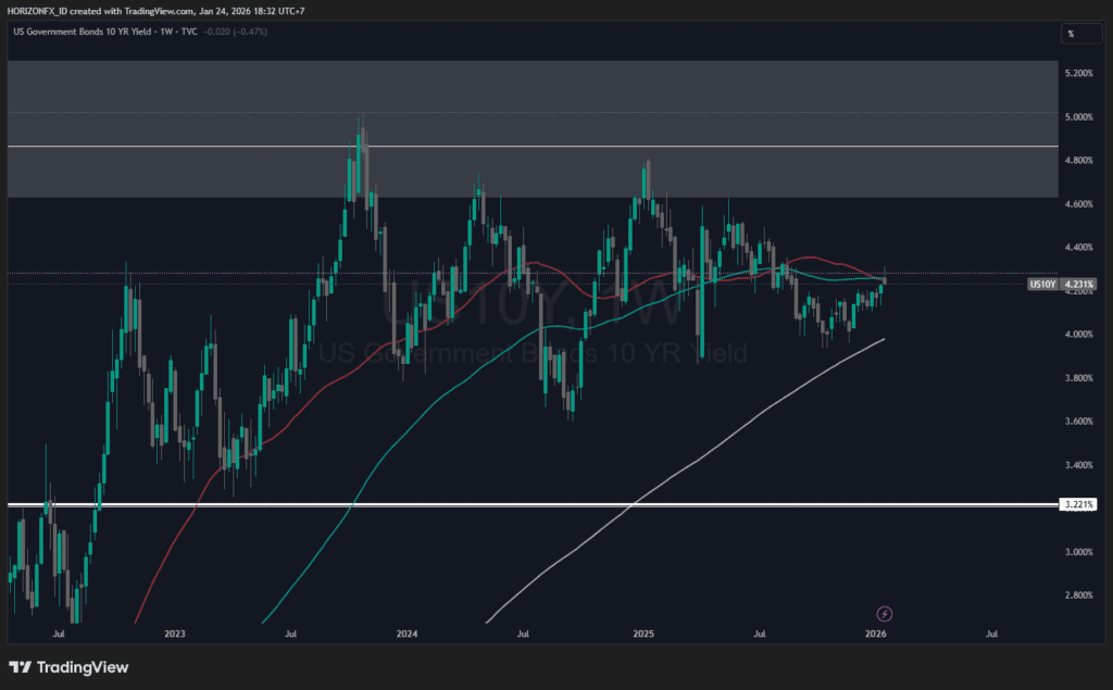 - US 10-Year Treasury Yield (US10Y): Secara tradisional, korelasi emas dan imbal hasil obligasi adalah negatif (berbanding terbalik). Namun, pada Januari 2026, kita melihat fenomena unik di mana keduanya naik secara bersamaan. Mengapa? Karena kenaikan imbal hasil saat ini didorong oleh Risk Premium (premi risiko), bukan oleh optimisme ekonomi. Ini mengajarkan kita bahwa ketika pasar obligasi sedang “stres”, emas berhenti berperan sebagai instrumen tandingan suku bunga dan mulai berperan sebagai instrumen lindung nilai terhadap kegagalan pasar.