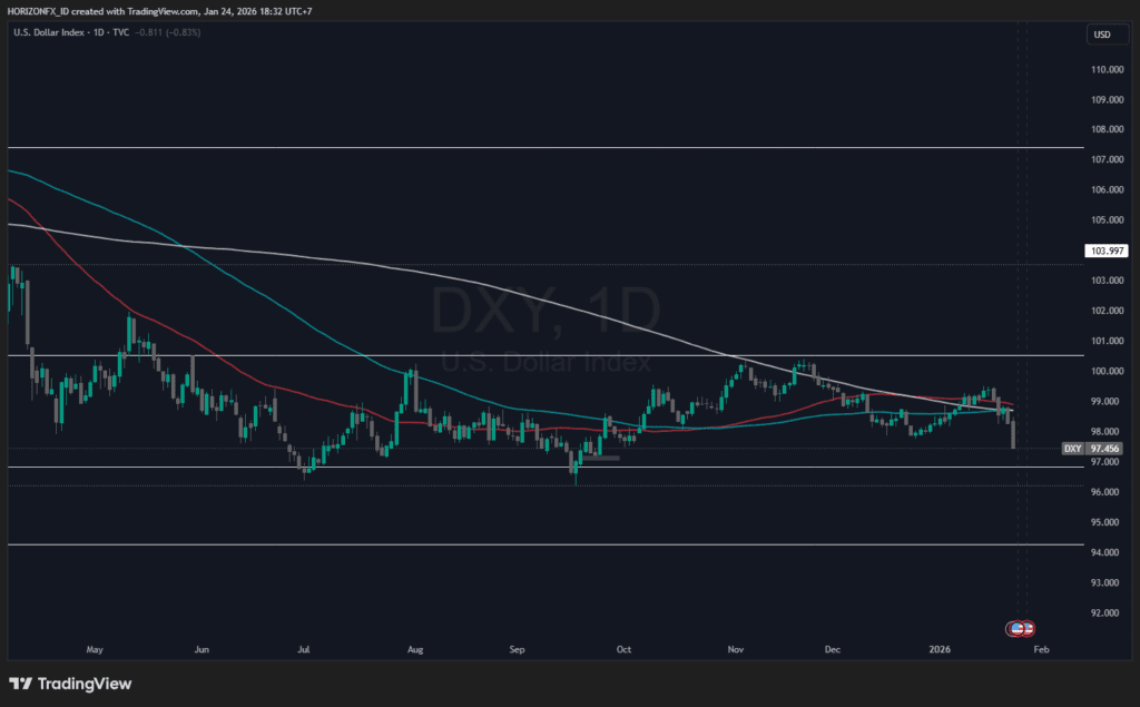 Katalis utama yang menggerakkan pasar pada 24 Januari 2026 ini adalah kombinasi dari ketidakpastian suksesi kepemimpinan di Federal Reserve dan eskalasi retorika diplomatik terkait klaim wilayah strategis. Spekulasi mengenai calon pengganti Jerome Powell, yang dianggap oleh pasar sebagai figur yang lebih “politis” dan rentan terhadap tekanan fiskal dari Gedung Putih di bawah administrasi Trump, telah memicu kekhawatiran akan devaluasi Dolar secara sengaja melalui kebijakan moneter yang terlalu longgar.