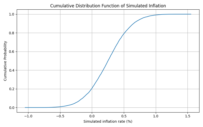 Grafik Fungsi Distribusi Kumulatif (CDF) di atas memberikan gambaran yang lebih jelas. Kita dapat melihat bahwa ada kemungkinan 50% inflasi berada di bawah sekitar 0,3%. Probabilitas inflasi di bawah 0,7% mencapai 90%. Ini menegaskan bahwa kemungkinan lonjakan inflasi yang ekstrem sangatlah kecil, meskipun tidak nol.