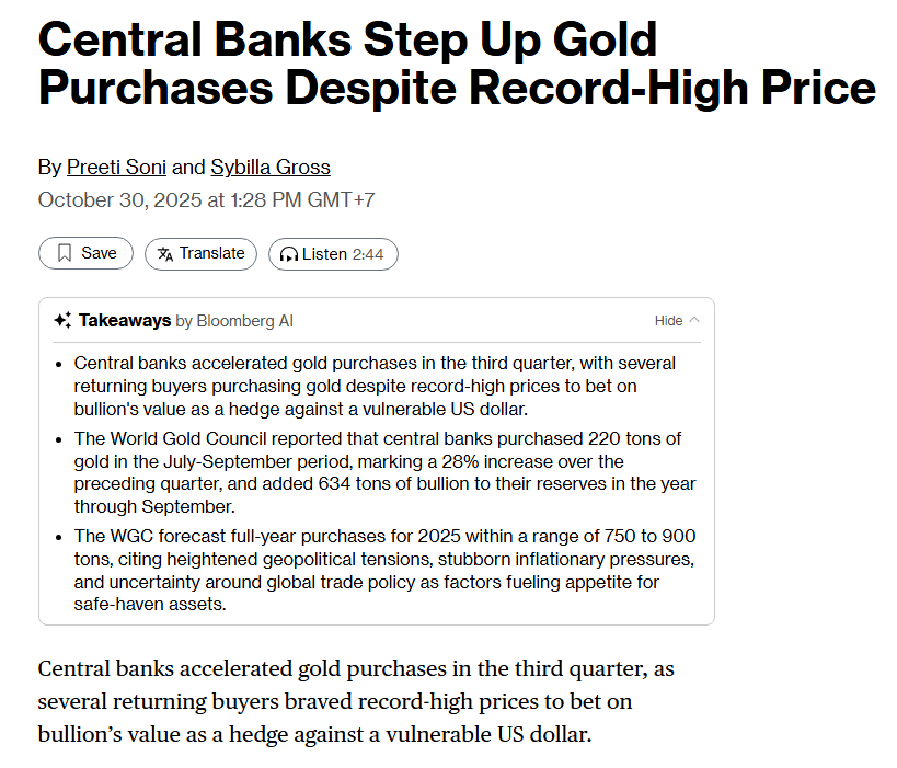 Faktor struktural yang lebih besar sedang bermain. Bank-bank sentral di seluruh dunia (terutama di Tiongkok, Rusia, India, dan Turki) secara agresif membeli Emas dalam jumlah rekor.