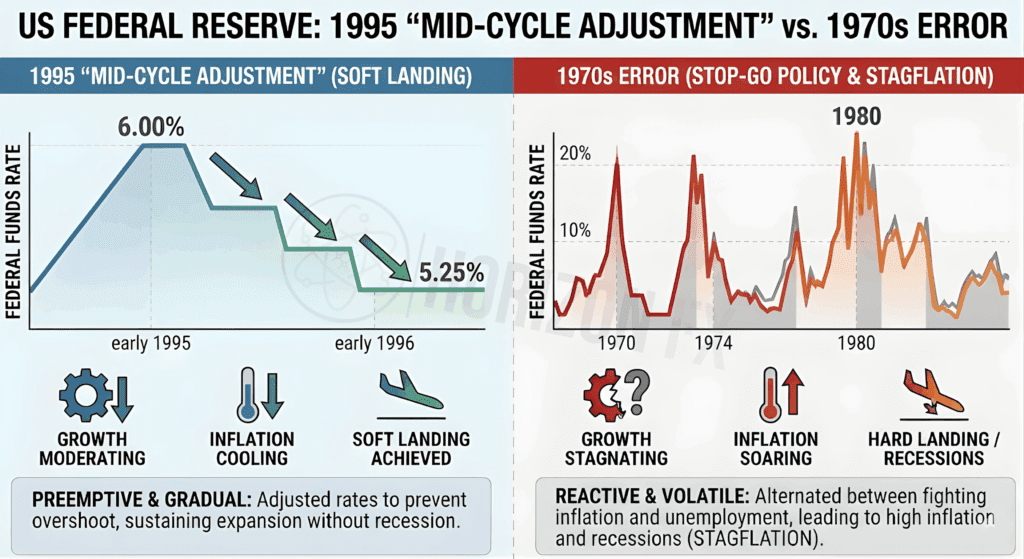 Situasi ini mengingatkan kita pada “Mid-Cycle Adjustment” tahun 1995 di bawah Alan Greenspan, bukan krisis 2008.