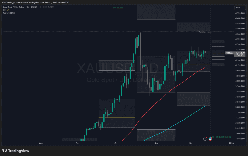 - XAU/USD: Bearish Pressure. Emas akan kesulitan menembus resistance karena opportunity cost memegang emas meningkat seiring yield obligasi yang tertahan tinggi.